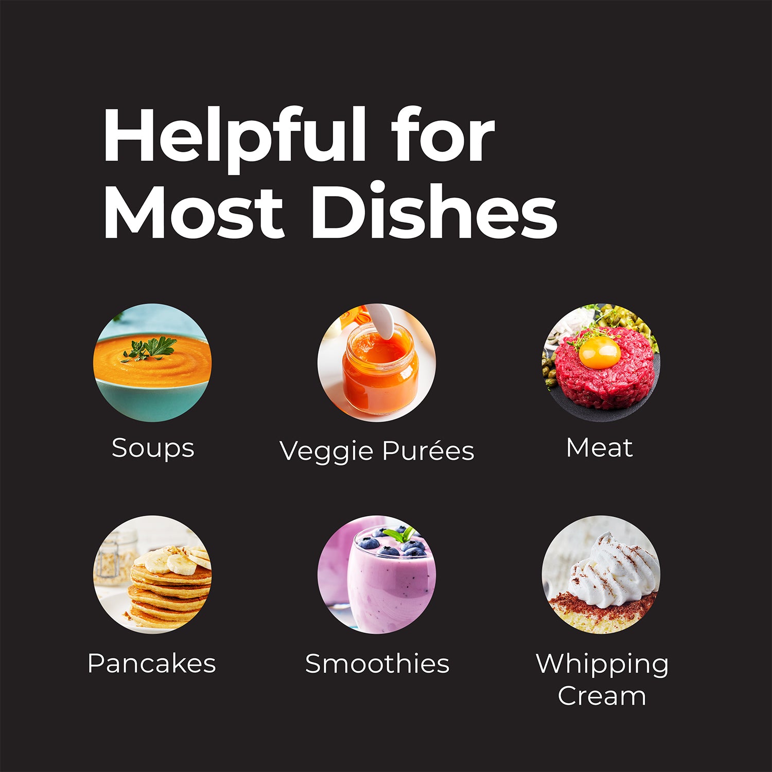Soups, Veggie Purée, Meat, Pancakes, Smoothies and Whipping Cream